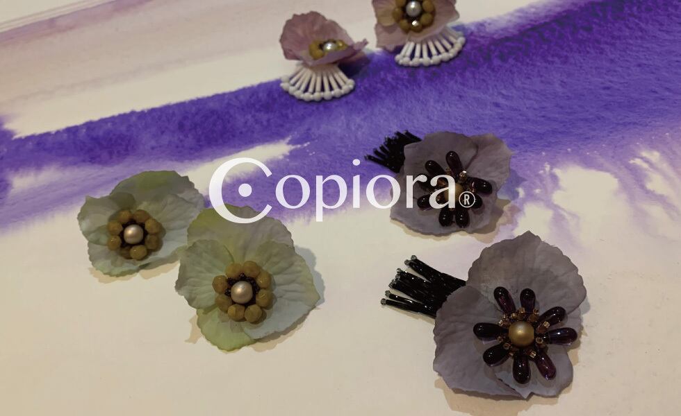 アーティフィシャルフラワーに、ヴィンテージビーズをあしらったクリップ式イヤリング。